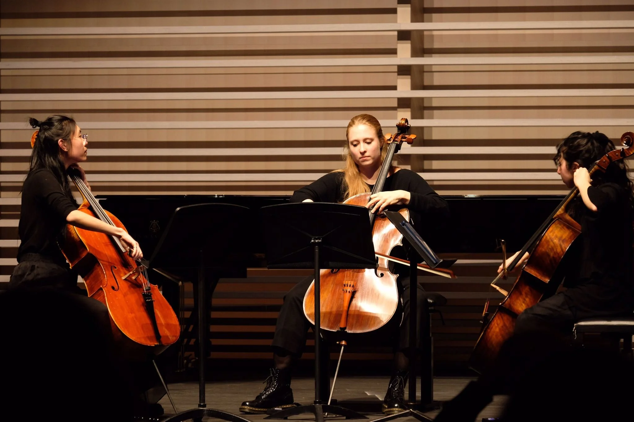 ONO Trio brings together three young cellists from diverse backgrounds—Caparica (Portugal), Changchun (China), and Schmalkalden (Germany). Their paths converged at the HFMT Köln, where they were shaped by solo and chamber music influences from renowned musicians such as S. Müller-Hornbach, K. Dill, A. Puliaev, J. Schwab, Wen-Sinn Yang, A. Winter, G. Schwabe, S. Krams, and many others.